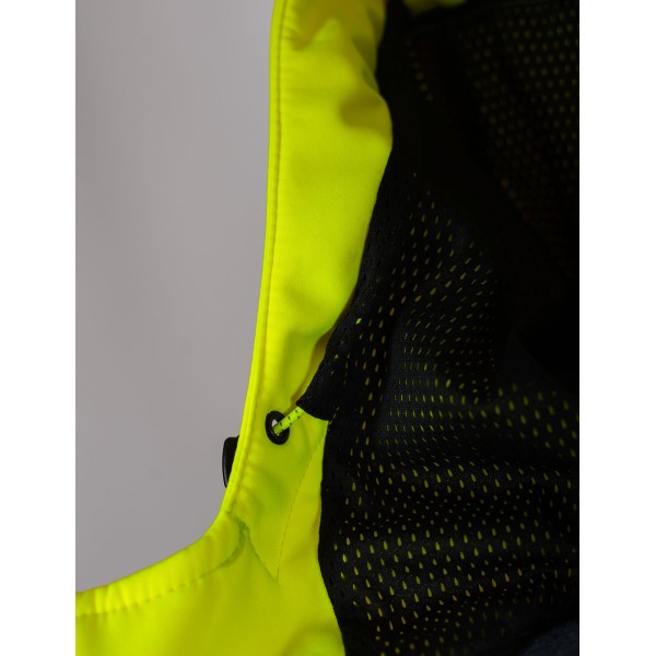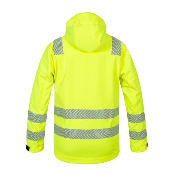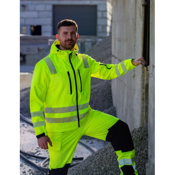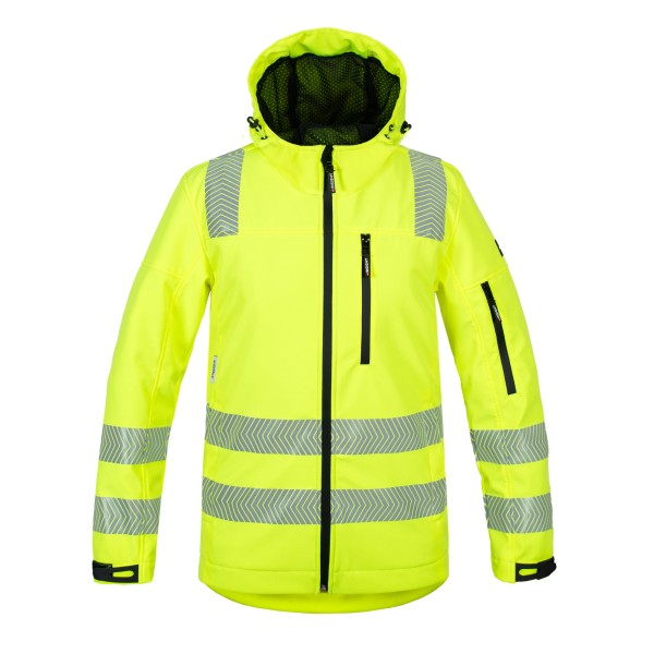 Функціональна якісна сигнальна софтшелова куртка. Багато зручних кишень. Водонепроникні застібки. Регулювання рукавів та капюшона за обсягом. Комфортна підкладка з сітки зпереду. Інноваційні сегментовані світлоповертаючі стрічки