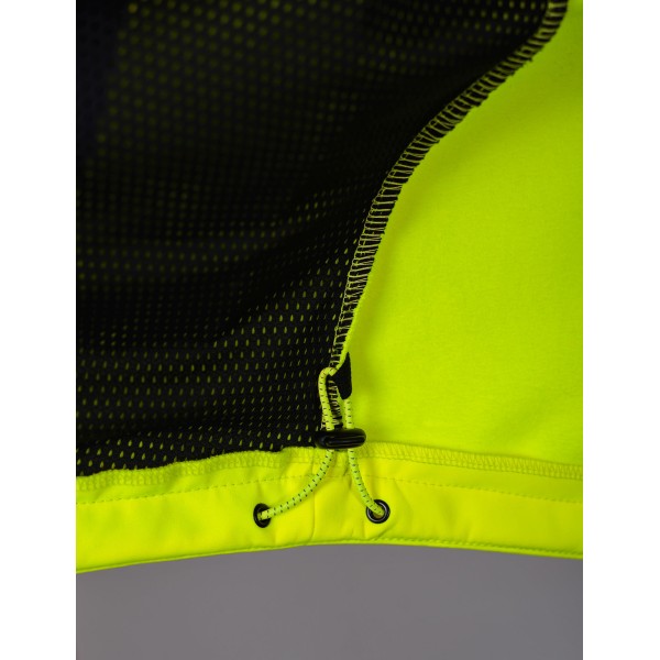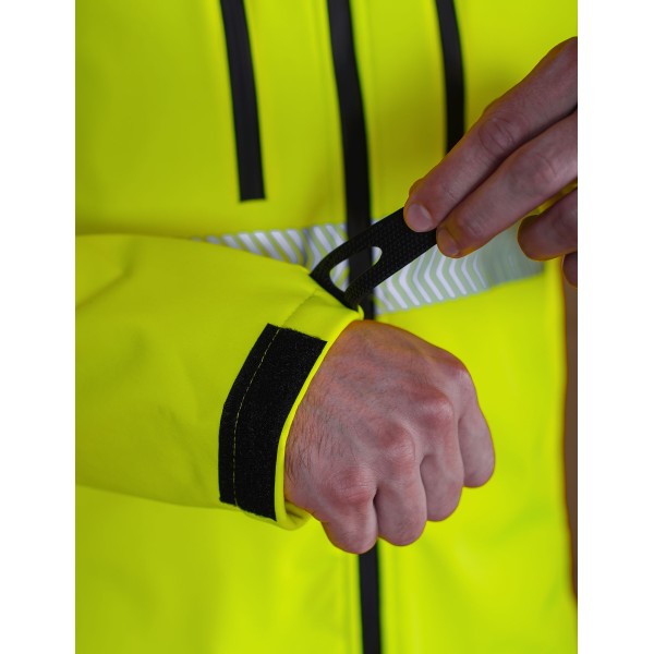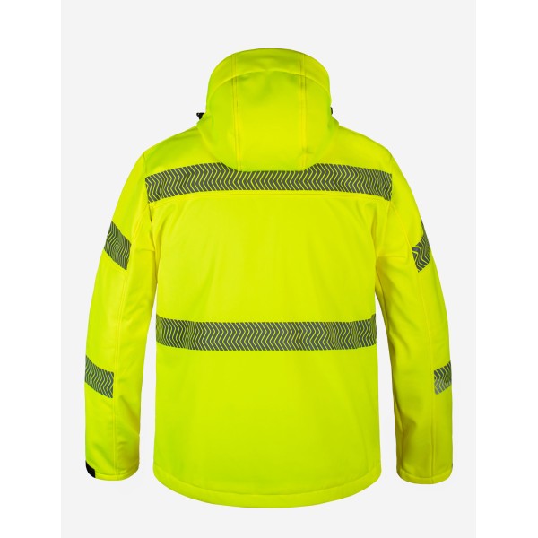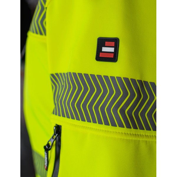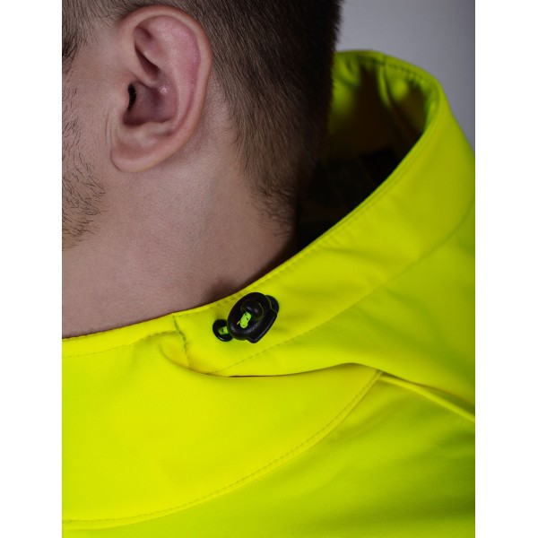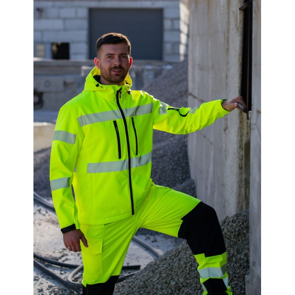 Функціональна якісна сигнальна софтшелова куртка. Багато зручних кишень. Водонепроникні застібки. Регулювання рукавів та капюшона за обсягом. Комфортна підкладка з сітки зпереду. Інноваційні сегментовані світлоповертаючі стрічки