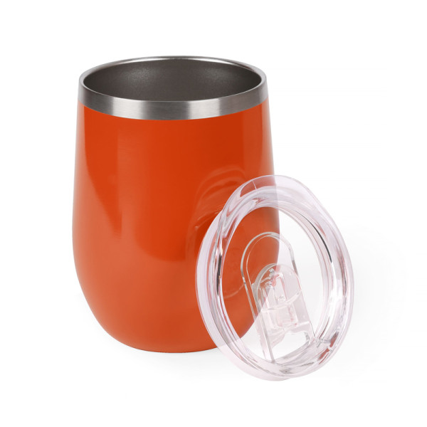 Металева термочашка з подвійними стійками з нержавіючої сталі ( глянцеве покриття емаль) і пластиковою прозорою кришкою з сувним клапаном. Кришку можна мити в посудомийній машині. Корпус мити тільки вручну, щоб не пошкодити кольорове покриття. Підтримує температуру протягом 6-ти годин