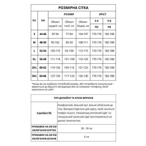 Розміри: S-3XL, зріст: H3 (170-176см); H4 (182-188см).