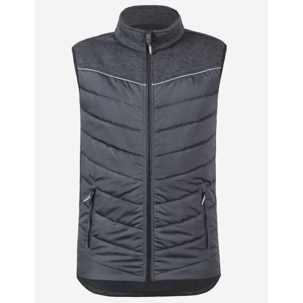 Стильний чоловічий жилет, поєднаний з функціональних матеріалів: меланжевий трикотажний фліс та стьобана плащова тканина. Утеплений технологічним синтепухом. Відмінно підійде для робіт на вулиці в холодну пору року та для холодних приміщень, а також повсякденного використання. Сигнальні світлоповертаючі канти для додаткової безпеки в темну пору доби.